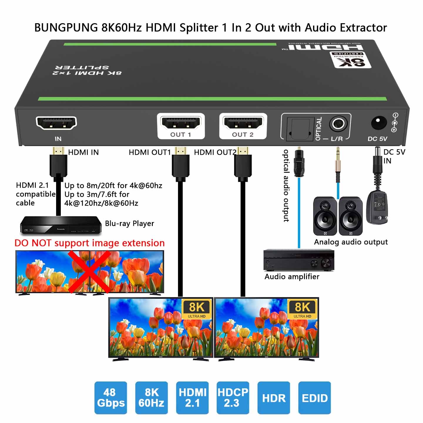 8K@60Hz HDMI Splitter 1 in 2 out Audio Extractor EDID Management-BUNGPUNG