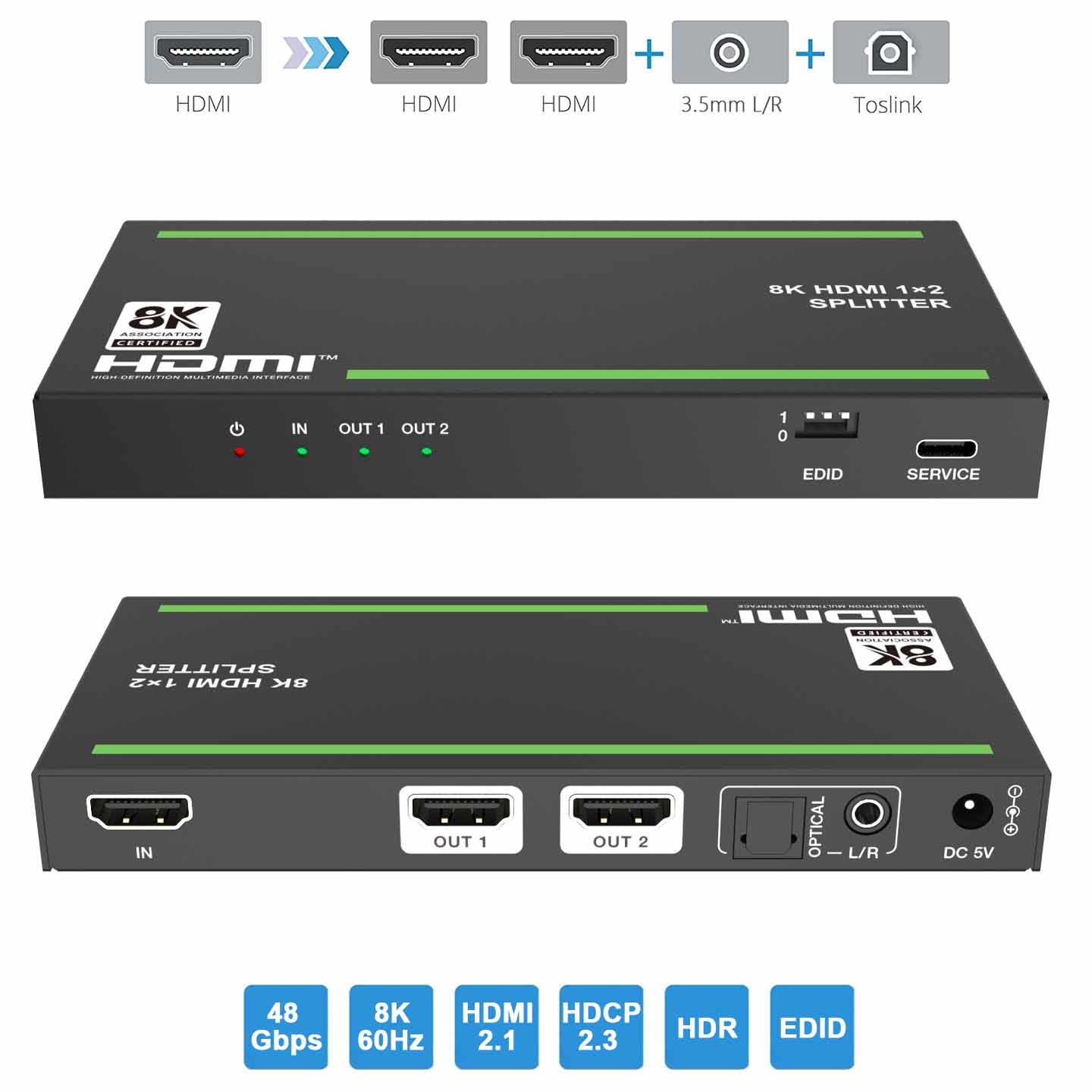The BUNGPUNG 8K HDMI Splitter 1 in 2 out is a compact, high quality solution for distributing a HDMI 2.1 signals to 2 HDMI displays from a HDMI source device. it support video resolutions up to 8K@60Hz 4:2:0 12bit, 4K@120Hz 4:4:4 12bit, Support 48Gbps FRL and 18Gbps TMDS video bandwidth, compatible with HDMI 2.1 HDCP 2.3 HDR. a smart EDID management switch on the unit provides maximum compatibility with multiple different displays. it supports audio extract from HDMI source to optical and analog output.