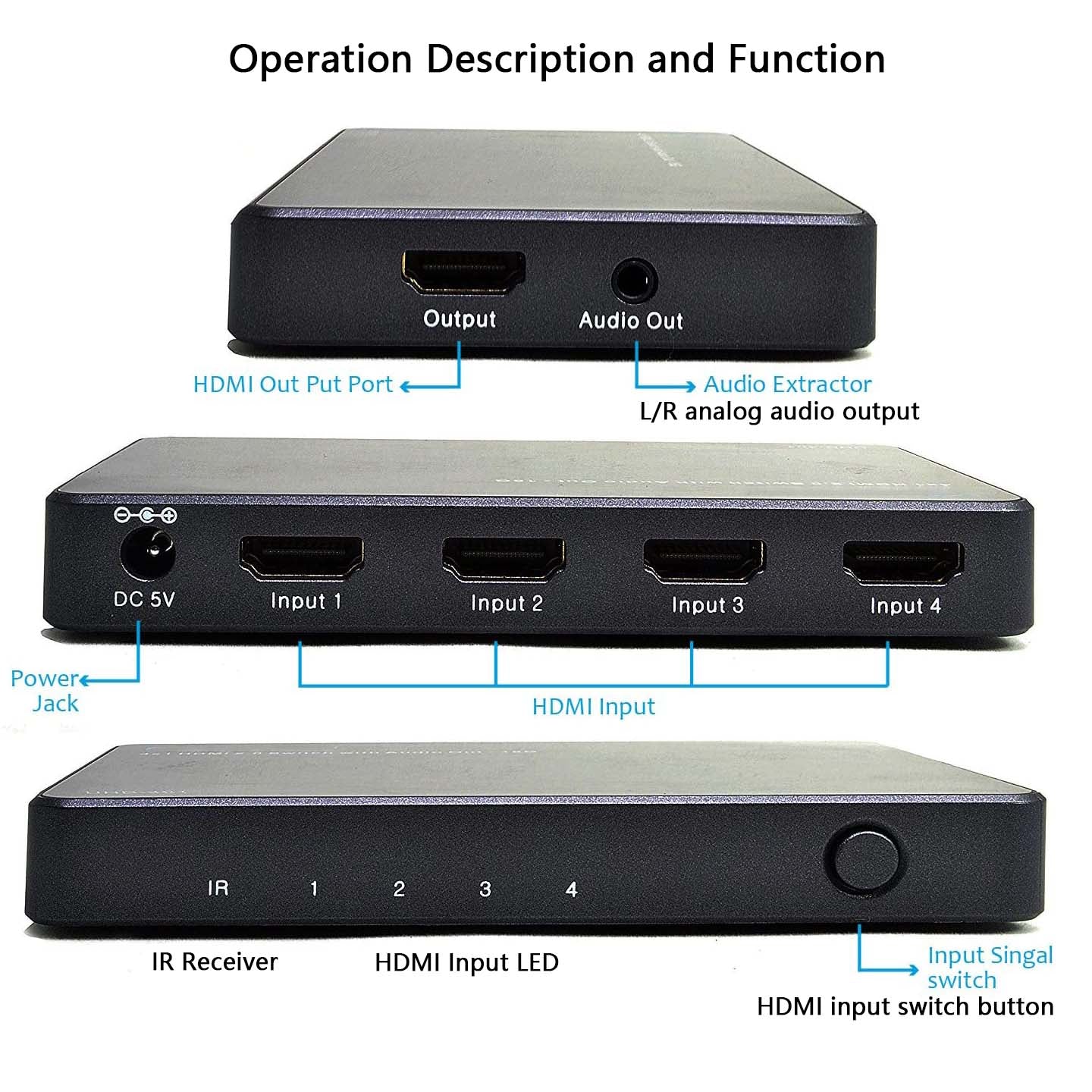- 4K@60Hz HDMI Switch 4 in 1 out: it switches between 4 HDMI source devices when connected to a single display, you can choose the HDMI signal source by the IR remote control and panel button, easy to access. it also Extracts HDMI audio to L/R analog output (LPCM only).